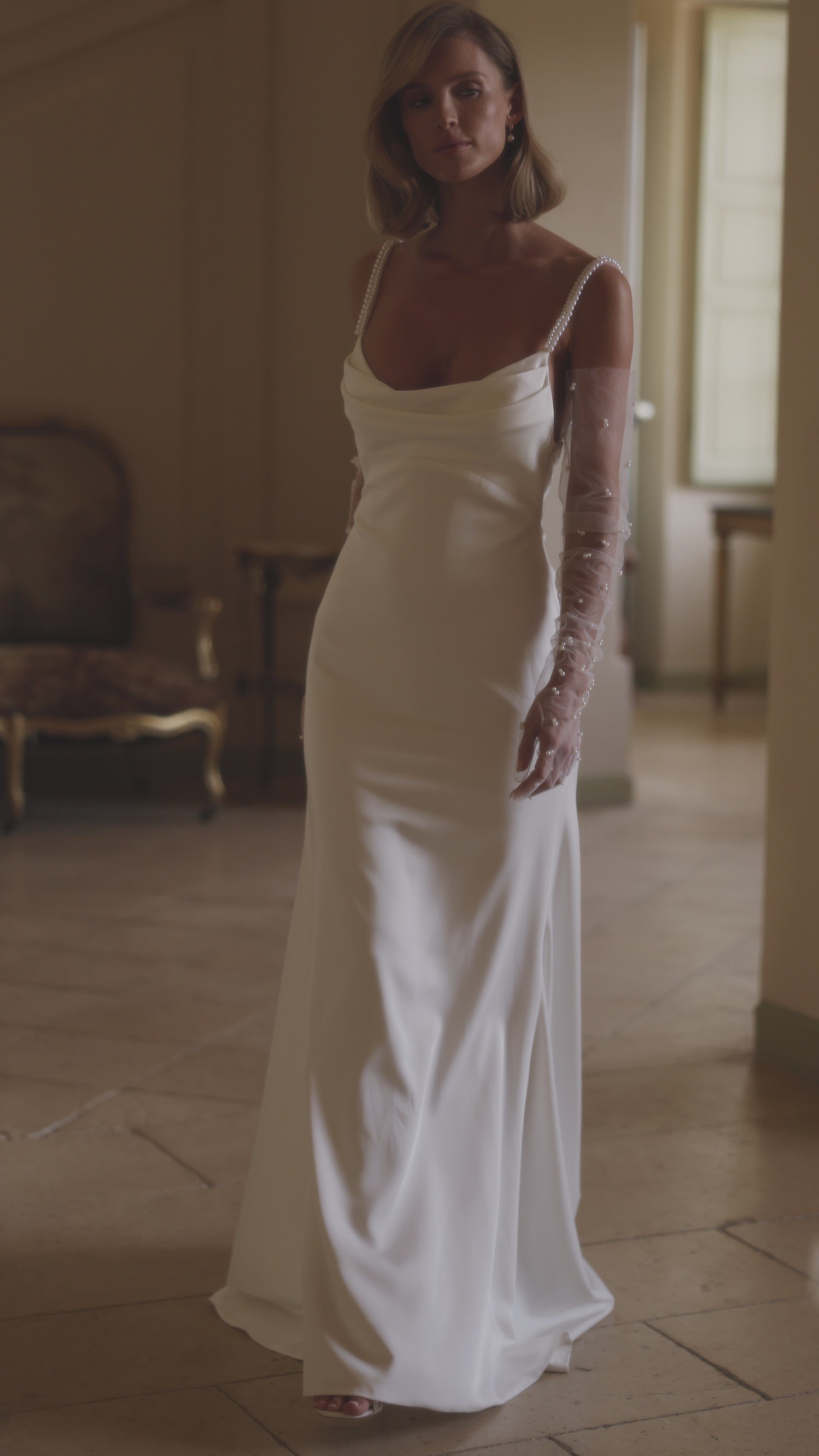 Her design features a gentle cowl neckline that falls effortlessly against the collarbone, paired with delicate pearl straps that frame the shoulders with understated romance. The back dips into a dramatic V edged with pearls, creating a moment of pure cinematic allure. Soft ruching along the lower back melts into a fluid, sweeping train — a touch of sculpture that moves like water behind you.